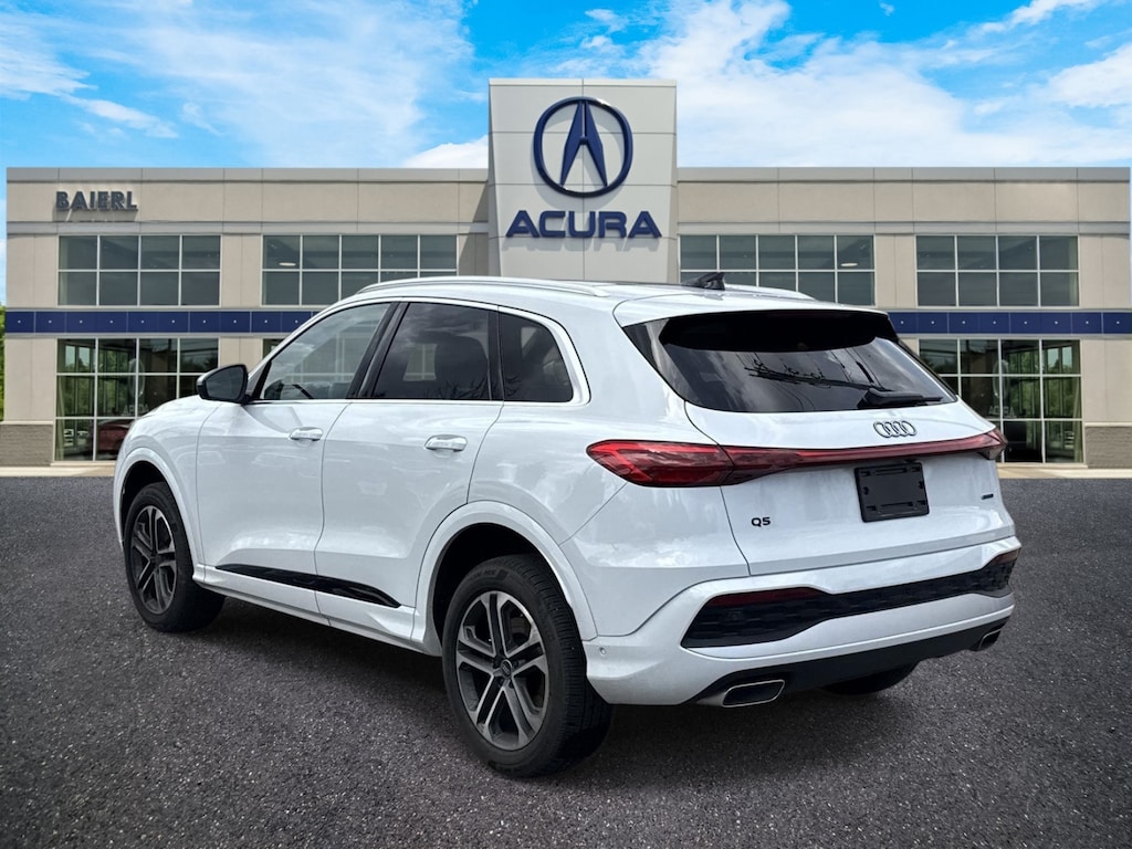 Baierl Acura is pumped up to offer this superb 2025 Audi Q5 in Glacier White Metallic. This vehicle has been through our award winning factory trained service department*** and comes with the following features; Balance of Factory Warranty, Theres no back-and-forth, we offer one fair price, CLEAN ONE OWNER CARFAX, PREMIUM PLUS PACKAGE, LED INTERIOR LIGHTING PRO PACKAGE, HEATED FRONT BUCKET SEATS, HEATED STEERING WHEEL, PANORAMIC ROOF SYSTEM, AUDI NAVIGATION PLUS, BANG & OLUFSEN 3D SOUND SYSTEM, APPLE CARPLAY / ANDROID AUTO, SIRIUSXM WITH 360L, HEAD-UP DISPLAY, TOP VIEW CAMERA SYSTEM, ADAPTIVE CRUISE ASSIST, FRONT COLLISION MITIGATION SYSTEM, AUDI SIDE ASSIST BLIND SPOT INFORMATION SYSTEM, AUDI PARKING SYSTEM PLUS FRONT AND REAR PARKING SENSORS, HEADLIGHT WASHERS, TRAILER HITCH, 19 5-DOUBLE-SPOKE DESIGN WHEELS, Black w/Leather Seating Surfaces, 10 Speakers, 4-Wheel Disc Brakes, ABS brakes, Adaptive Cruise Assist, AM/FM radio: SiriusXM w/360L, Animation For Headlights and Taillights, Auto High-beam Headlights, Auto tilt-away steering wheel, Auto-dimming door mirrors, Auto-dimming Rear-View mirror, Bang & Olufsen Sound System with 3D Sound, Brake assist, Bumpers: body-color, Compass, Delay-off headlights, Driver door bin, Driver vanity mirror, Dual front impact airbags, Dual front side impact airbags, Dynamic Interaction Light, Electronic Stability Control, Emergency communication system: Audi connect CARE, Exterior Parking Camera Rear, Four wheel independent suspension, Front anti-roll bar, Front Bucket Seats, Front Center Armrest, Front dual zone A/C, Front fog lights, Front reading lights, Garage door transmitter: HomeLink, Genuine wood console insert, Genuine wood dashboard insert, Genuine wood door panel insert, Head-Up Display, Headlight Washers, Heated door mirrors, Heated Front Bucket Seats, Heated Steering Wheel with Hands-on Detection, Illuminated entry, Leather Seating Surfaces, Leather steering wheel, LED Headlights Plus with Digital DRL, LED Interior Lighting Pro Package, Low tire pressure warning, Memory seat, Navigation system: Audi Navigation Plus, Occupant sensing airbag, Outside temperature display, Overhead airbag, Overhead console, Panic alarm, Panoramic Sunroof, Passenger door bin, Passenger vanity mirror, Power door mirrors, Power driver seat, Power Liftgate, Power passenger seat, Power steering, Power windows, Premium Plus, Radio data system, Radio: MMI Navigation Plus, Rear air conditioning, Rear anti-roll bar, Rear fog lights, Rear reading lights, Rear seat center armrest, Rear window defroster, Rear window wiper, Remote keyless entry, Roof rack, Security system, Speed control, Speed-sensing steering, Speed-Sensitive Wipers, Split folding rear seat, Spoiler, Steering wheel mounted audio controls, Tachometer, Telescoping steering wheel, Top View Camera System, Traction control, Trip computer, Turn signal indicator mirrors, USB Power Delivery (2x60W Front and 2x100W Rear), Wheels: 19 5-Double-Spoke Design.